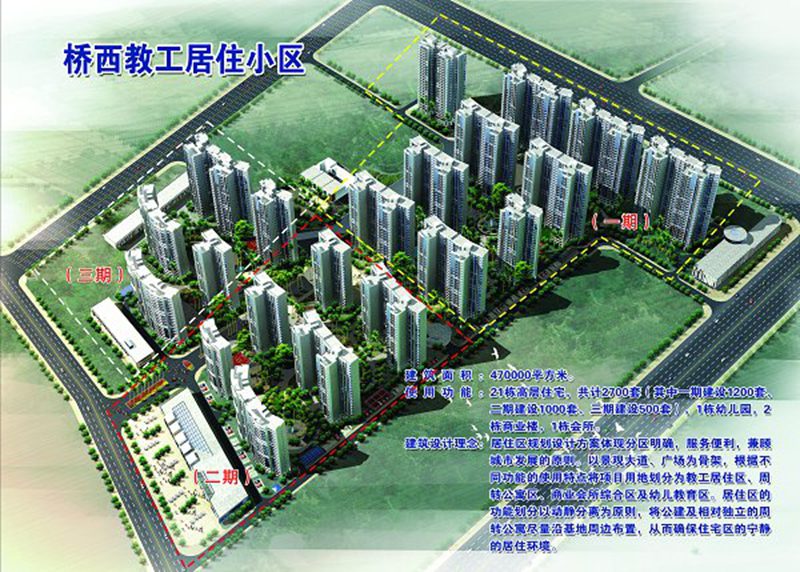 2、建设内容与规模。小区总建筑面积约50万平方米,总户数约2700套,小区修建性详细规划已经基本完成(见小区规划图)。本次合作项目,主要为第一期建设的1222套职工住宅房及其配套设施,单体设计正在进行中,需要与合作方洽谈后确定最终方案。